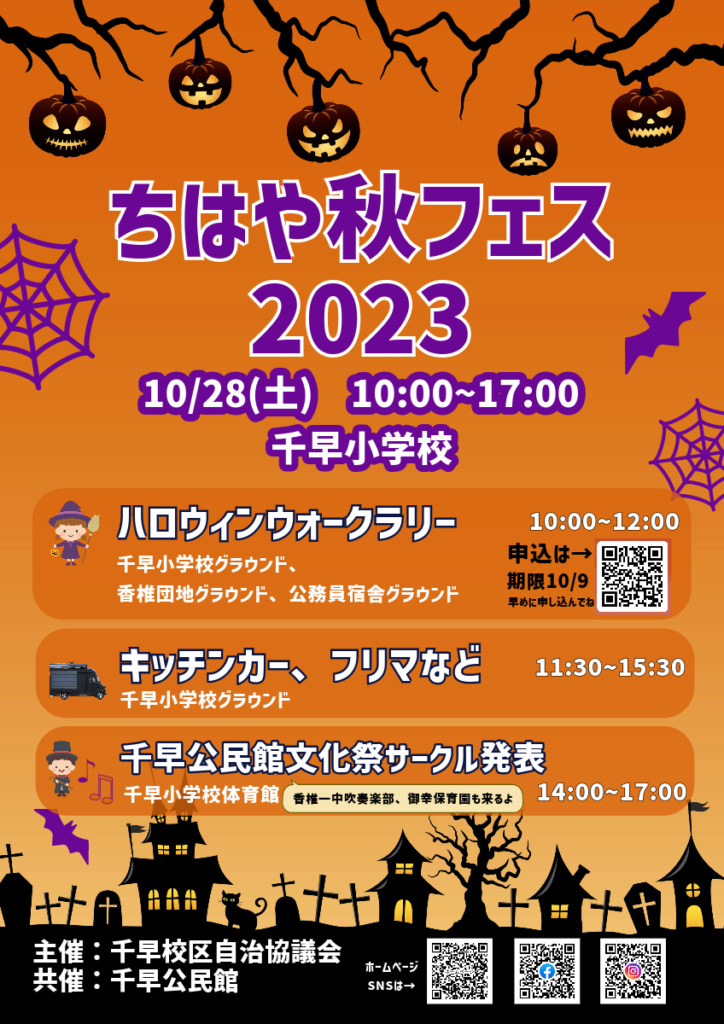 今年もやります!ちはや秋フェス2023 Posted on 10/11/2023 by 千早管理者 コロナ禍を経て誕生した新しいイベント「ちはや秋フェス」 2022年から開始し2年を迎えアップデートして開催します。 今年は千早公民館文化祭と同日開催! たくさんの皆さんの来場お待ちしております。 ※ハロウィンウォークラリーは申込が必要です。