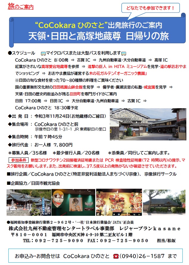 今年の夏に「旅」をテーマにした宗像旅行サークルを立ち上げました。こんな時だから、まずは「旅の思い出話」を語り合うことから始め、専門家や仲間のアドバイスを受けながら旅行計画を立てたり、新型コロナが収束したら本当に旅に出ちゃおう!ということで、国内・海外は問わず、旅行が大好きな人なら、どなたでも参加できる集まりです。そんな宗像旅行サークルが、このたび、旅行代理店の協力を得て、紅葉がきれいな11月24日(水)に「天領・日田と高塚地蔵尊日帰り旅行」を企画しました。一般の方も参加できますので、興味のある方はスタッフまでお問合せください。