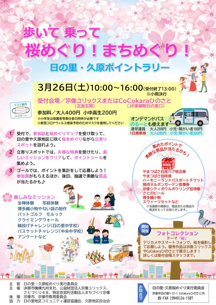 歩いて乗って 桜めぐり!まちめぐり! 7 3月,2022 wpcocokarahinosato 3月26日土曜日、宗像市日の里地区および久原地区において、桜をめぐりながら、いろいろな体験ができるポイントラリーを開催します。受付会場はCoCokaraひのさとと宗像ユリックスです。参加賞のほか、後日素敵な商品が当たる抽選もありますので、ご家族や友人を誘ってぜひご参加ください!