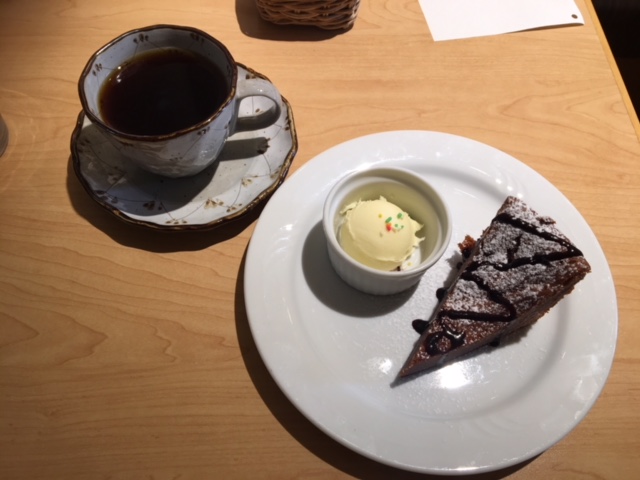 食後にはケーキセットも頂きました。ケーキは日によって変わるそうで、今回はガトーショコラとバニラアイスでした。とても濃厚で美味しかったです。