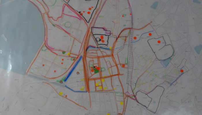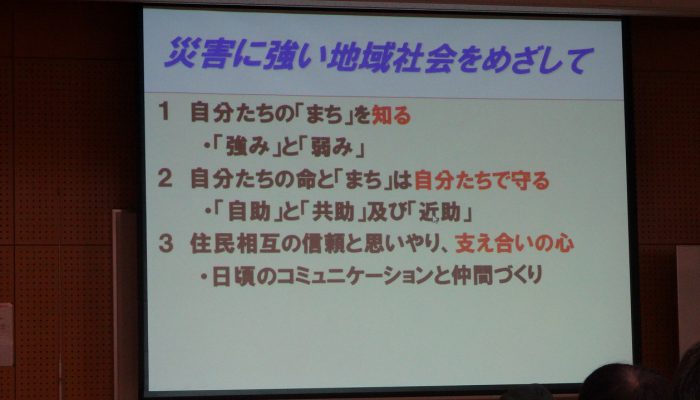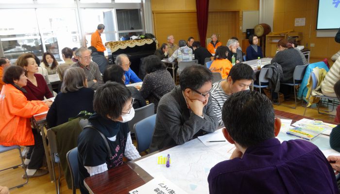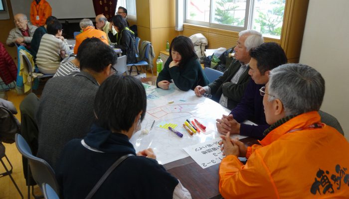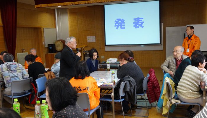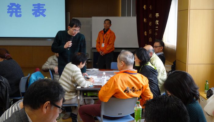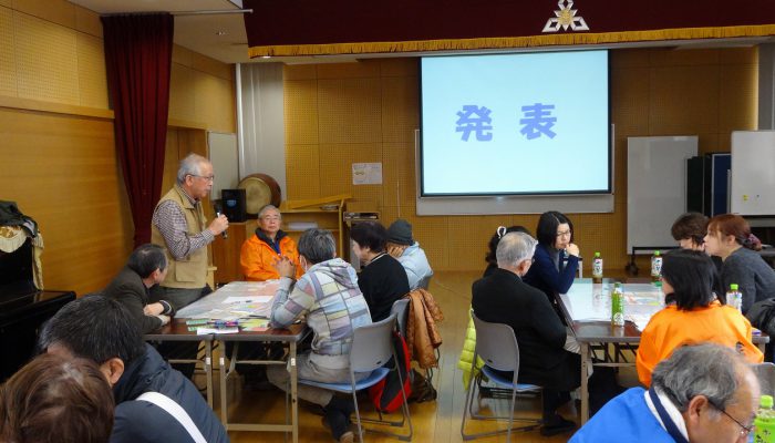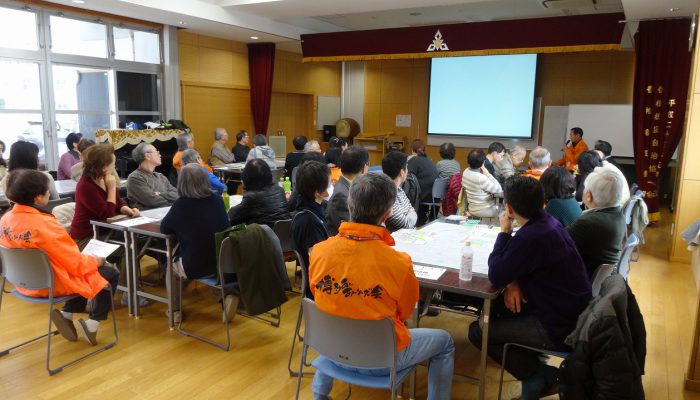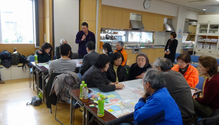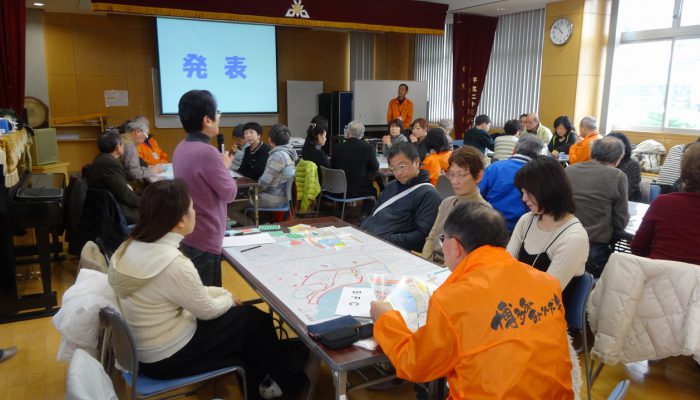町内会長、各種団体リーダー等、約40名が ①駅東1-1・1-2・2②駅前1-1,2,3・2-1③駅前3・よろい坂団地・よろい坂ハイツ④御島崎団地・若葉団地・フラワー・モントーレ⑤御島崎・SFC⑥駅前2-2・アンピール の6グループに分かれて自分達の地域の危険箇所、集会所、病院などの印を地図上につけました。そして、強み弱みなど地域の特徴を知り、災害の際どういう行動をとるべきかを討議し、発表しました。これを機に、各町内、各家庭で、いかに災害を減らすか話し合い『自分の町内は自分たちで守る・自分の命は自分で守る』ことを進めていく第一歩になればと思います。