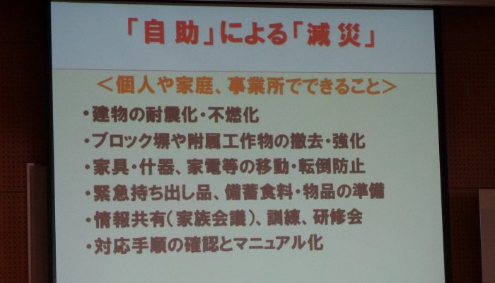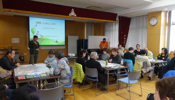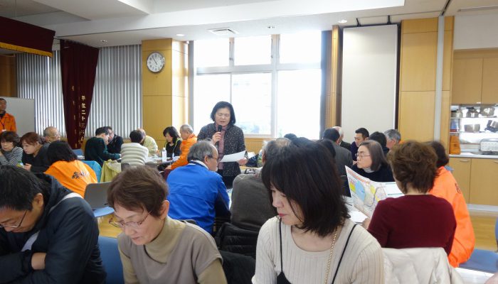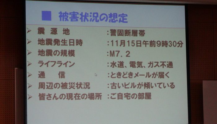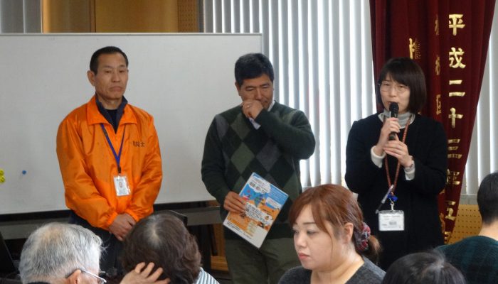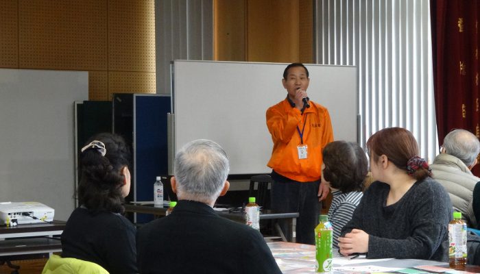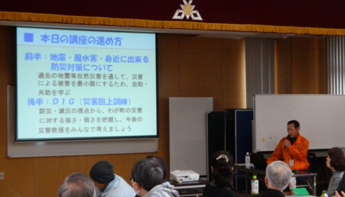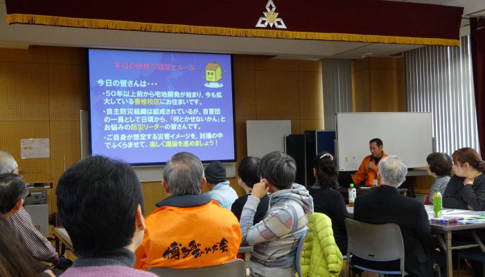 これは、福岡市の出前講座のひとつで、博多あんあんリーダー会東支部の防災士の方々等8名の講師と区役所防災危機管理課を迎え、ワークショップ形式で行いました。