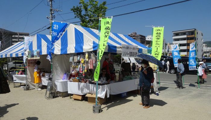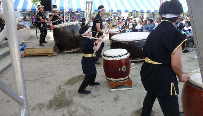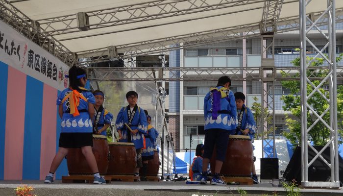 玄海高等学校邦楽部の「玄海太鼓」を皮切りに、日舞、フラダンス、バンド演奏等が披露されました。会場では東区の友好交流都市「安曇野市」から交流団の参加や、安曇野の物産品の紹介や福岡市シルバー人材センターの野菜の販売なども行われました。食バザーやfukuoka東区花火大会の応援ブースも大賑わいでした。