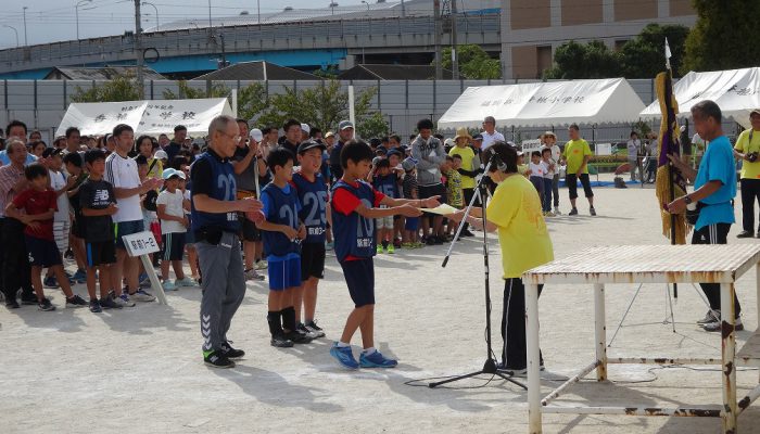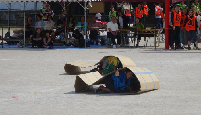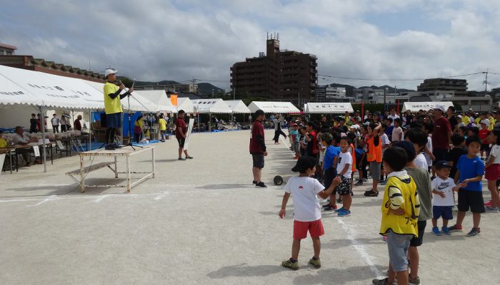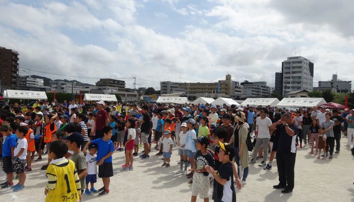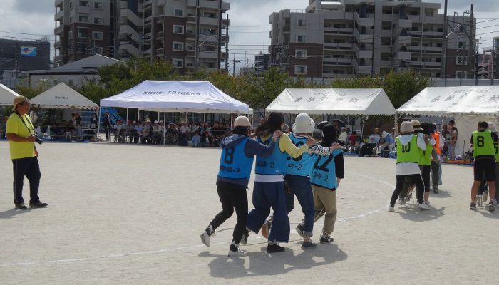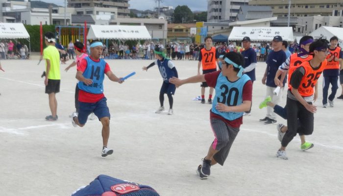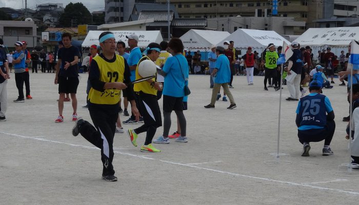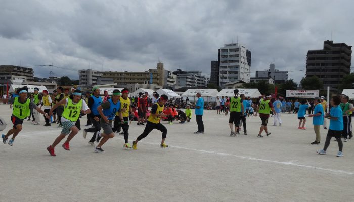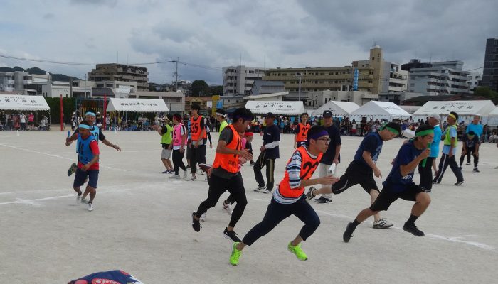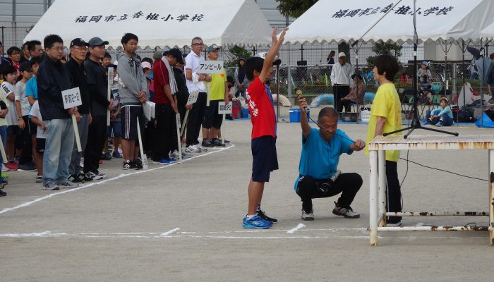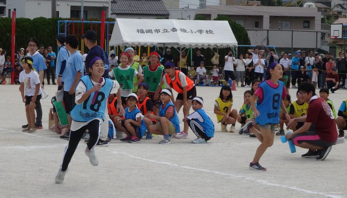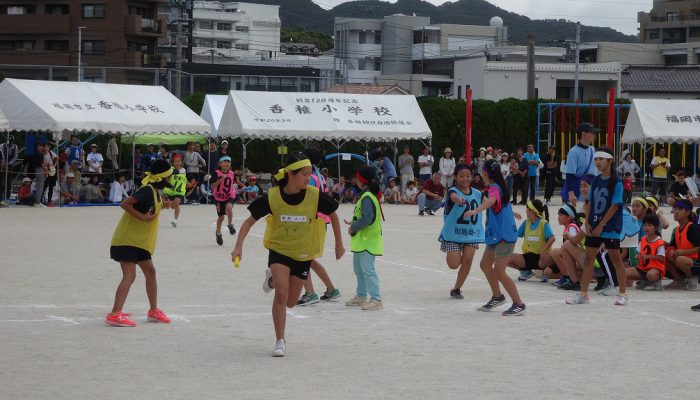 藤瀬体育協会会長、田代自治協議会会長のあいさつの後、選手宣誓が行われ、競技が始まりました。競技は、来年か再来年、香椎小学校に入学予定の子ども達の〈たのしいおやつかい〉を皮切りに〈愛の宅配便〉〈玉入れ〉〈台風の目〉〈むかで競争〉〈各種リレー競技〉など、各町内の皆さんの熱戦が繰り広げられました。結果は、香椎駅前3-1区(萩尾町内会長)が連続で優勝の栄誉を勝ち取りました。終了後、各町内では「打ち上げ」が行われて盛り上がったことでしょう。