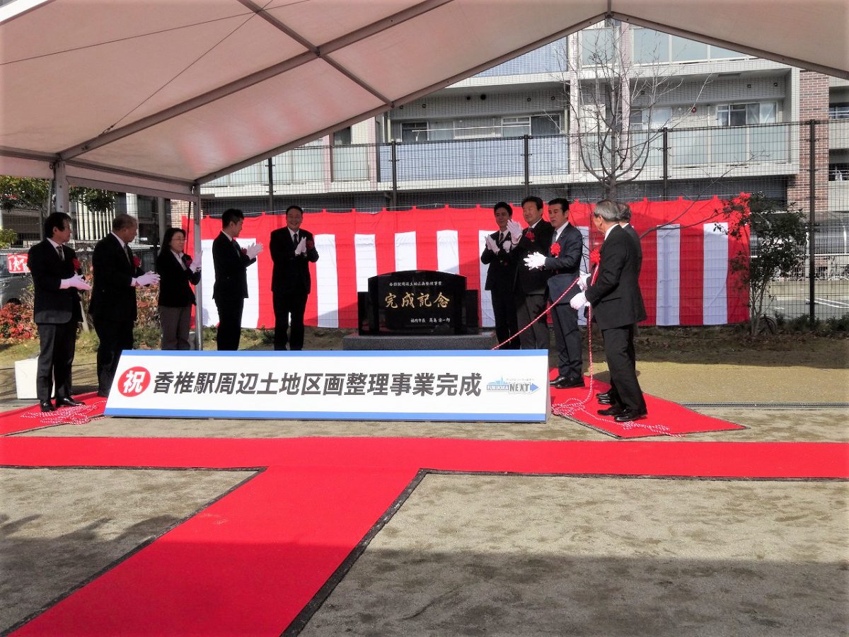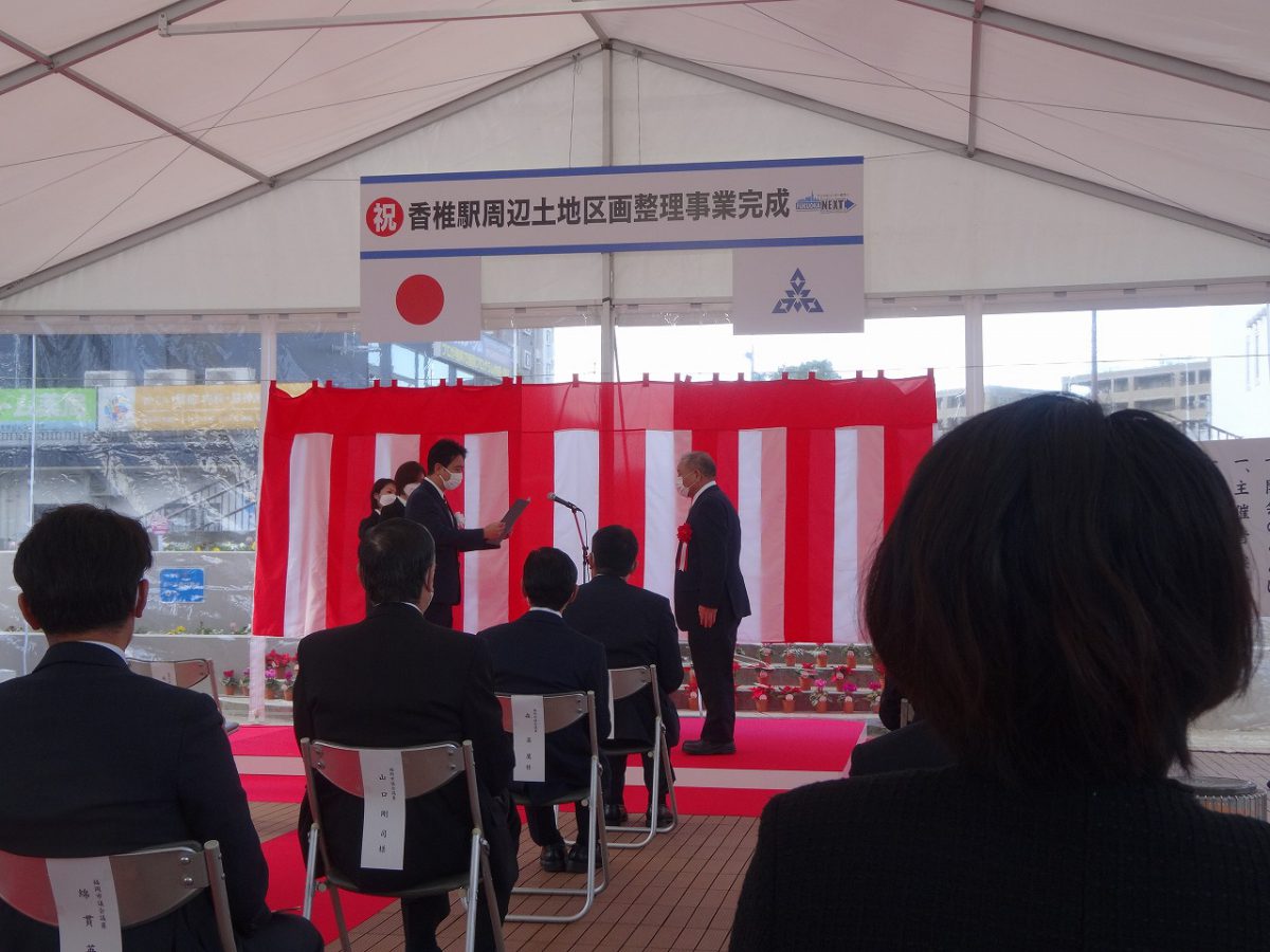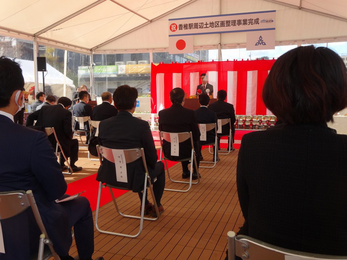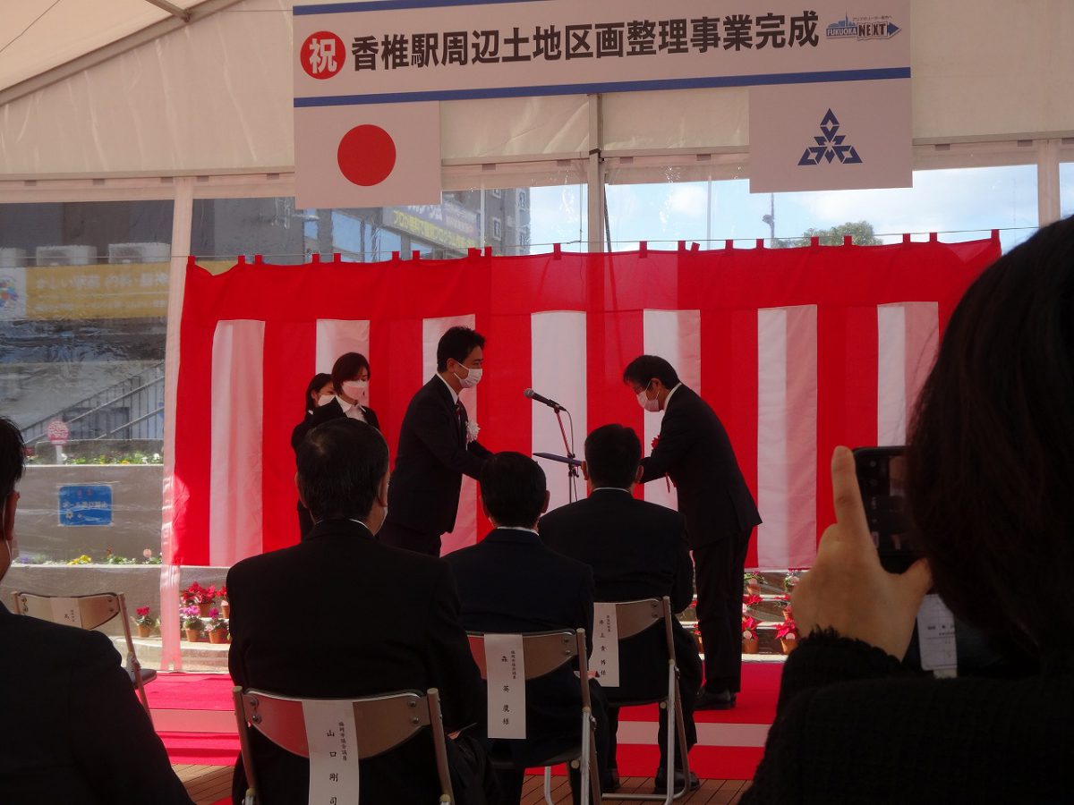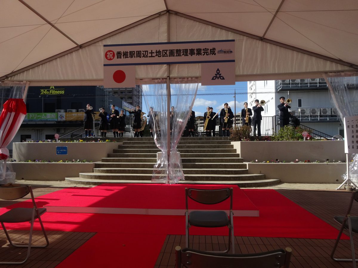 「香椎駅周辺土地区画整理事業完成記念式典」開催さる 2021/12/5 イベント情報, 新着情報 令和3年12月4日 香椎駅前西公園において、香椎駅周辺土地区画整理事業の完成を記念する式典が開催されました。高島市長、国会・市会議員の皆様の列席の下、区画整理事業に尽力された皆様への感謝状が贈られ、記念碑の除幕式の後、九州産業大学付属九州高等学校吹奏楽部の皆様の演奏で華が添えられました。(写真の一部は福岡市発行のリーフレットより転載)