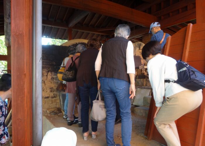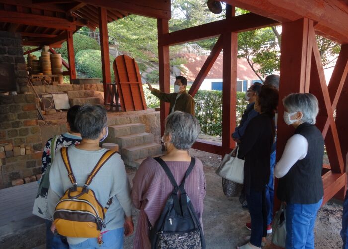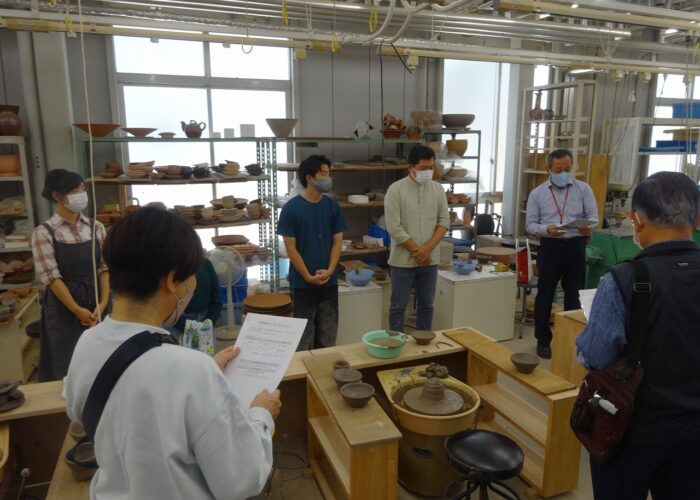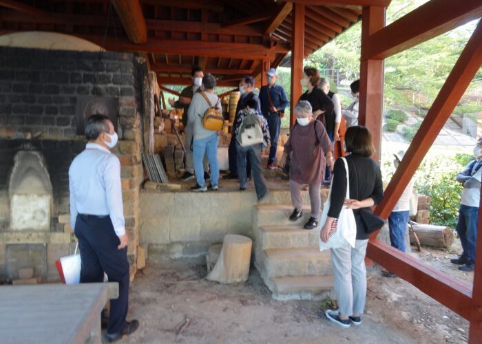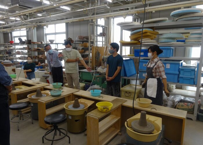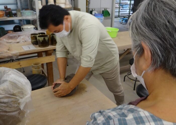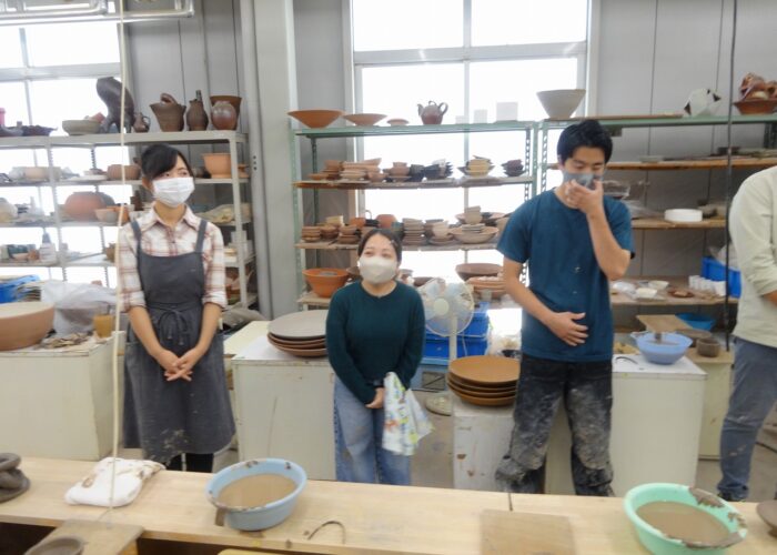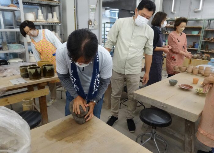 九州産業大学生活環境デザイン科の髙森誠司教授と3名の学生さんの指導の下、陶土のこね方から始まり、実際にろくろを回しての制作に取り組みました。教授やの手さばきにより、粘土(陶土)が生き物のように伸びたり縮んだりするのを見て、同じようにやりましたが思うようにならず悪戦苦闘しましたが、学生さん達の指導により何とか作品?を創り上げることができました。今後、大学の方で仕上げ作業後、釉薬を塗っていただき窯焚き(11月11日)・窯出し(11月16日)で作品の完成となる予定です。窯炊きは、昼夜を通して窯の管理が必要で、大変な苦労があると聞きました。髙森教授は有田を拠点に制作もされており、日本伝統工芸展入選、西日本陶芸美術展大賞等多くを受賞され、大学では陶芸家を目指す若者に陶芸の基礎技術の指導を行っておられます。