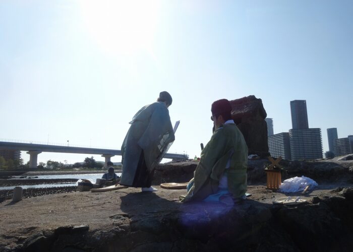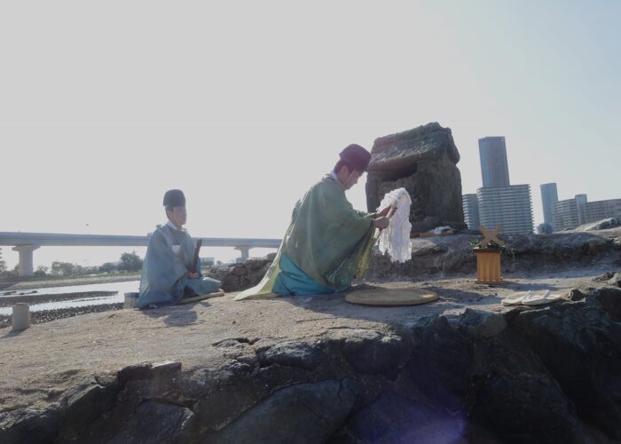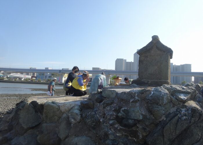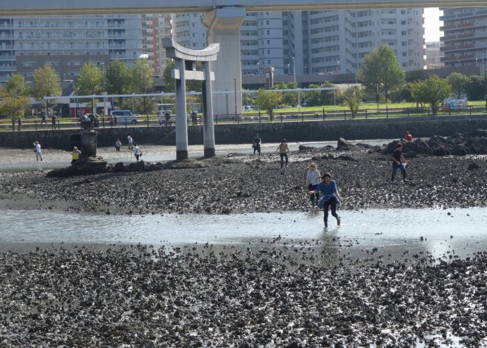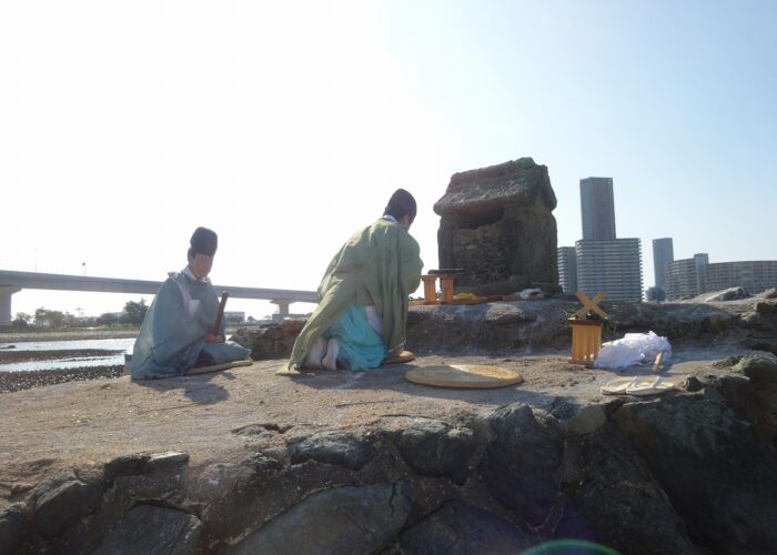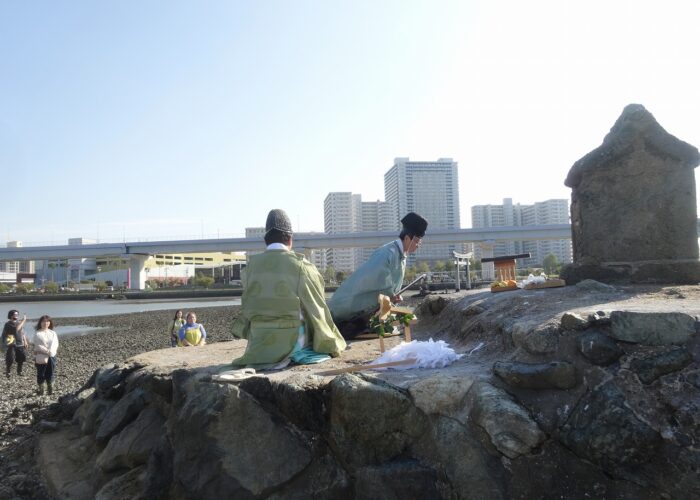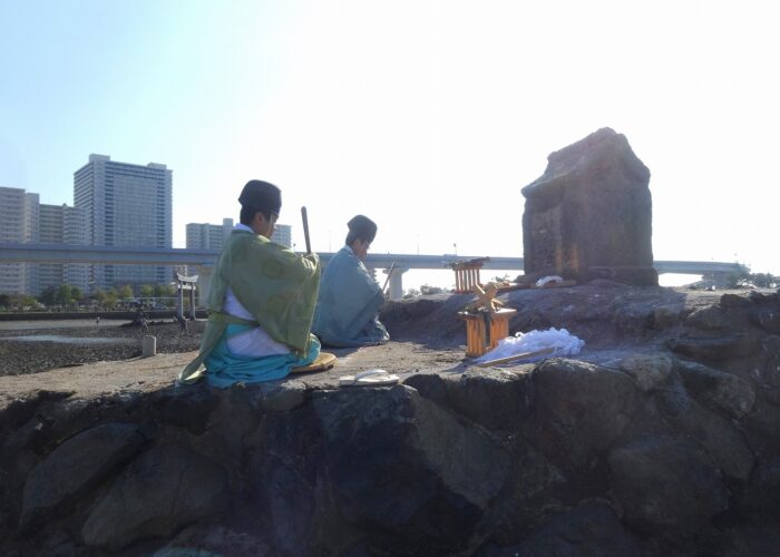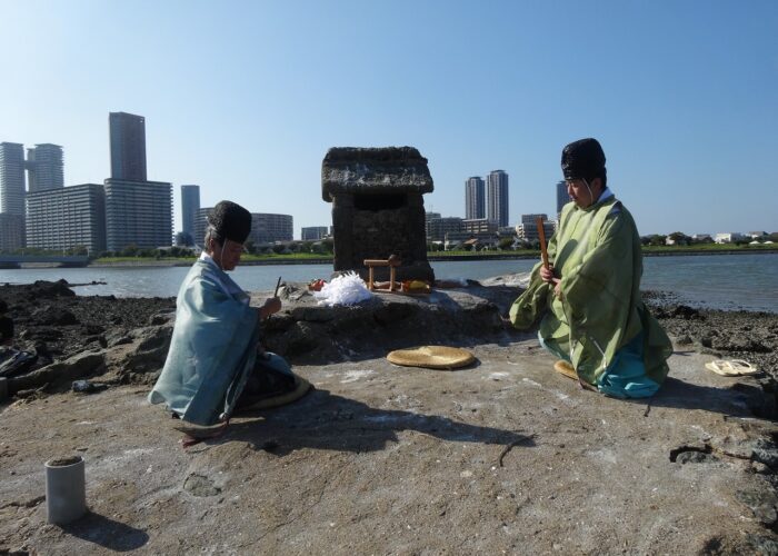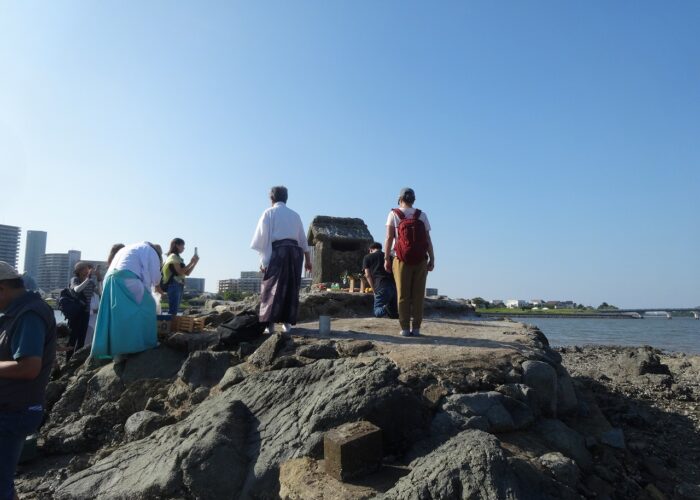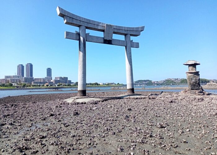 9月29日、中秋の名月の日「御島神社例祭」が執り行われました。干潮に合わせた時刻に海の中に鎮座する祠まで、牡蠣殻と泥にさいなまれながらの参拝は、宮司をはじめ参拝される方々も苦労しての道のりでした。しかし、祠にたどり着くと清々しい海風に苦労も忘れ、神聖な気持ちで祝詞を拝聴し一年の安全を祈願して帰路につきました。そばの鳥居が、祠でもなく香椎宮でもない方向を向いていることを参拝者の方が宮司に尋ねられると、「ここから神功皇后(じんぐうこうごう)が神羅(朝鮮半島)に出陣されたことから、朝鮮半島に向いている」ということでした。