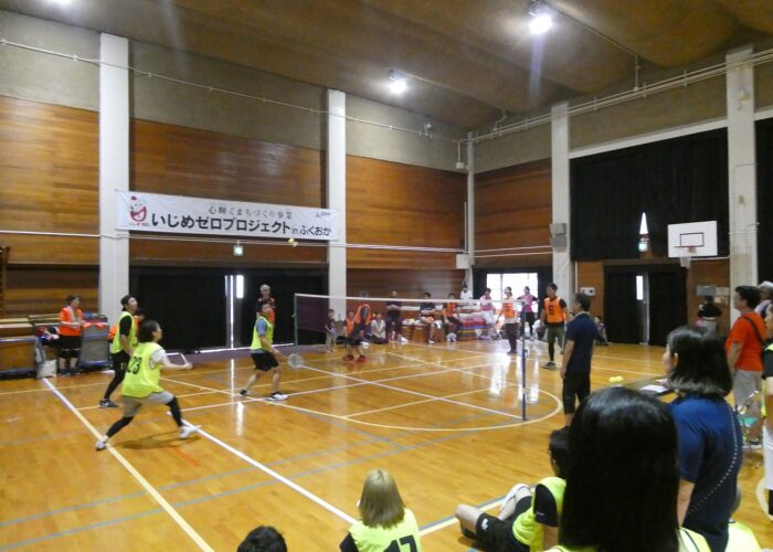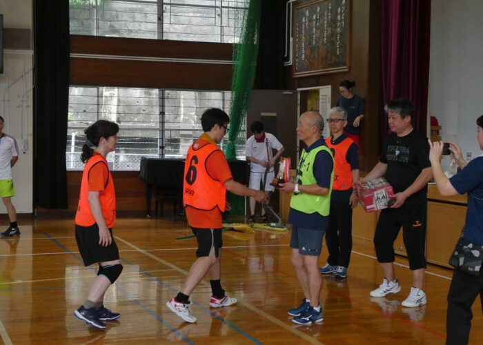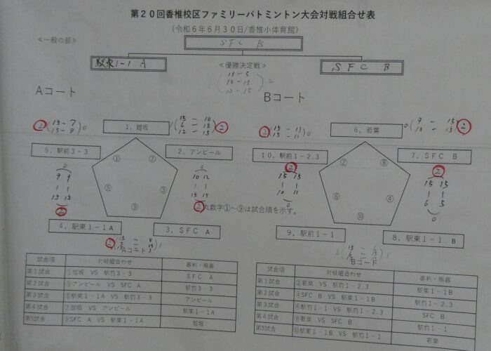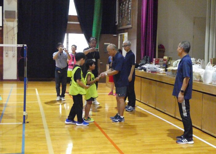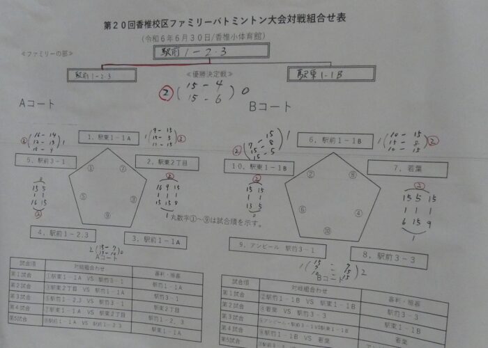 第20回香椎校区ファミリーバトミントン大会 2024/7/2 イベント情報, 新着情報, 部会・団体活動報告 6月30日(日)香椎校区スポーツ振興会(旧・体育協会)主催の「第20回香椎校区ファミリーバトミントン大会」が開催されました。一般の部10チーム、ファミリーの部10チームの参加でした。笑いも出るような和気あいあいの雰囲気の中にも熱のこもった対戦が行われ、ファミリーの部は「香椎駅前1-2,3」チーム、一般の部は「SFC(御島崎 海と森の自治会)」チームが優勝の栄誉を勝ち取りました。
