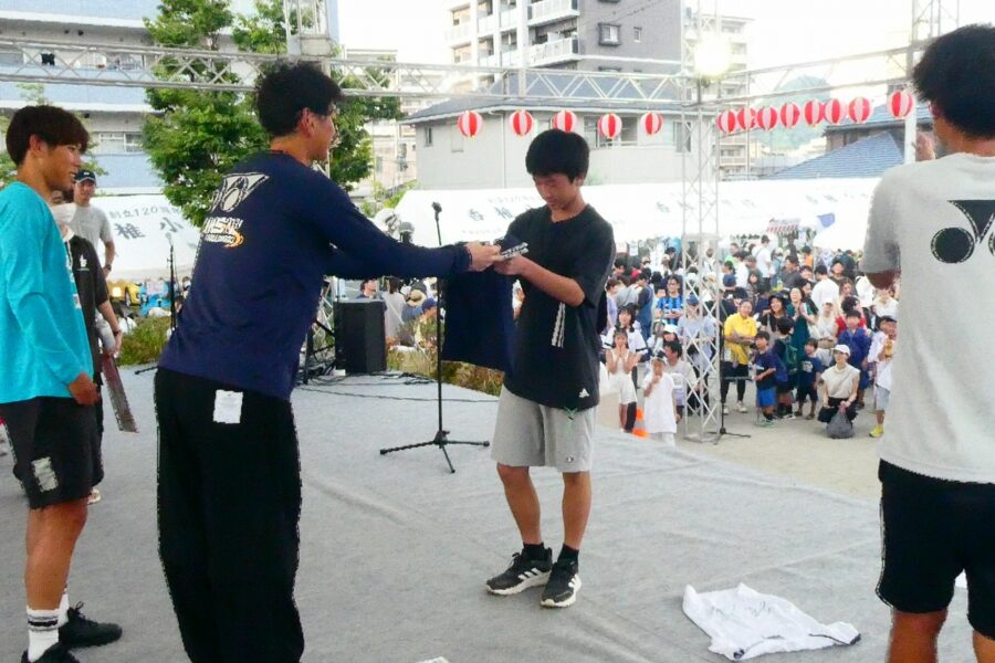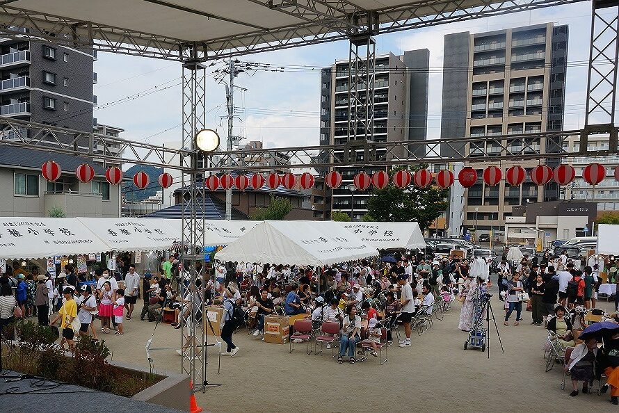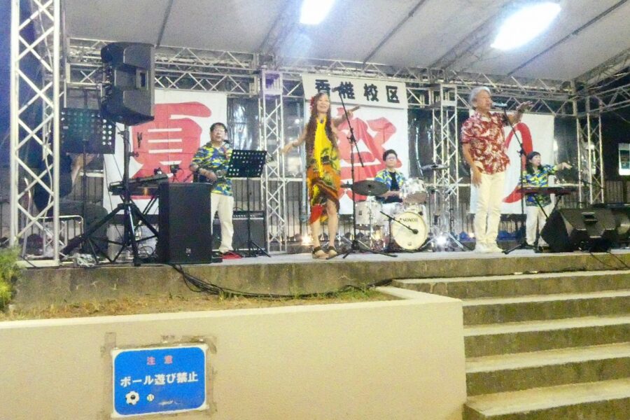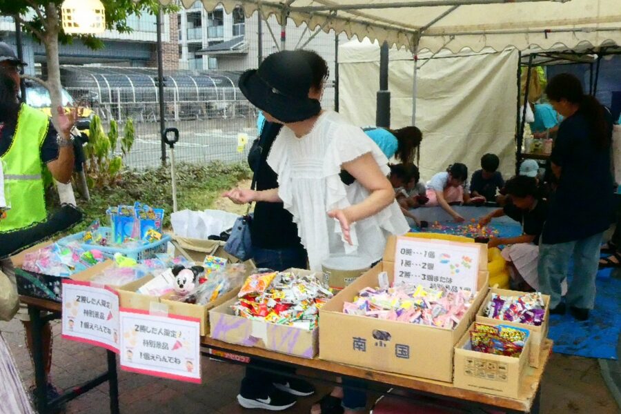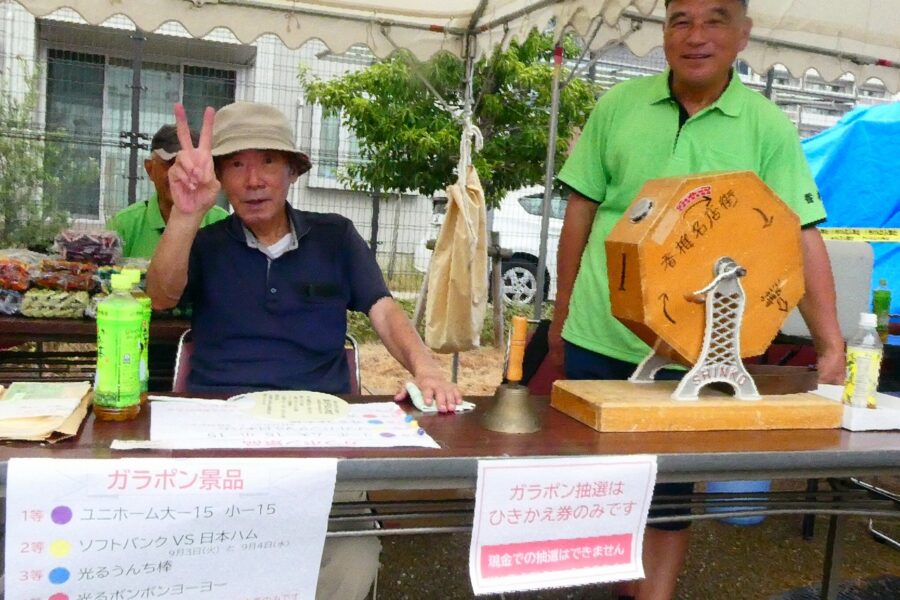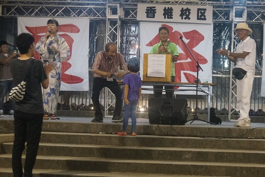 会場の香椎駅前西公園は人・人・人と大賑わいで、最後のお楽しみ抽選会まで、皆さん大いに楽しんでいただけたことと思います。校区夏祭りは町内会、各種団体、香椎商工連盟、消防団などの協力で開くことが出来ており、この点についても重ねて感謝しております。