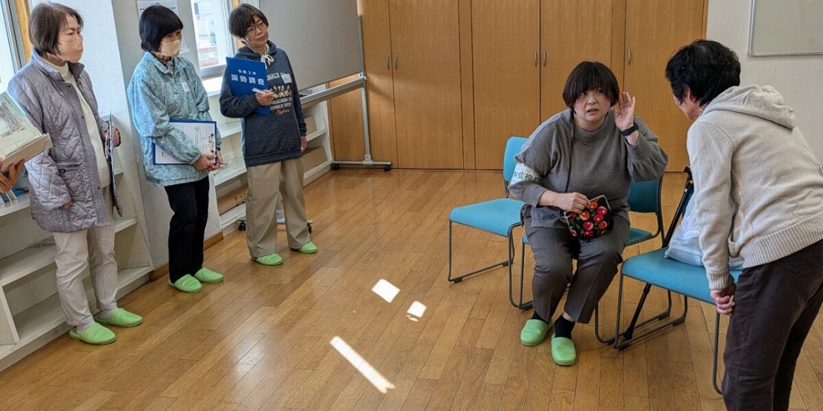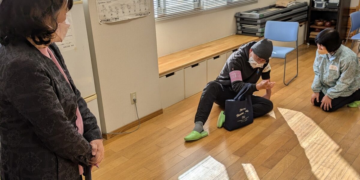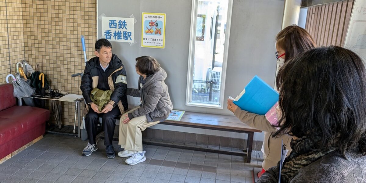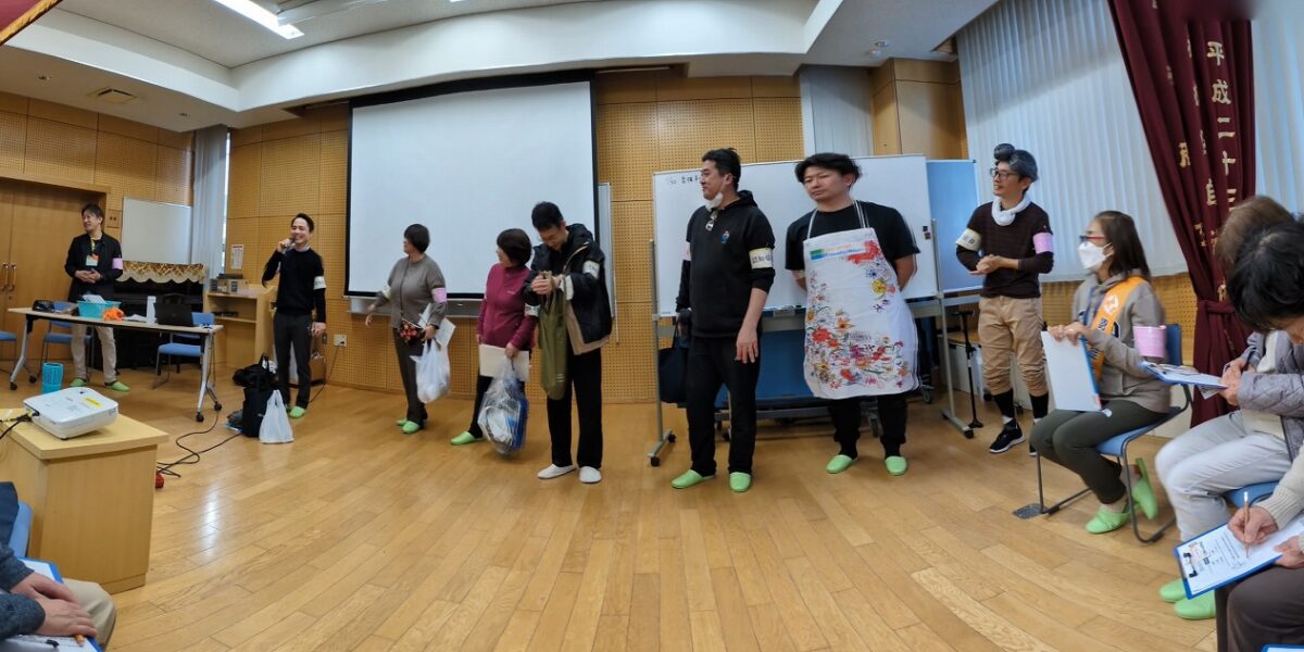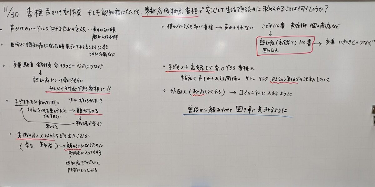 訓練には、東第3いきいきセンターふくおかをはじめ、地域の高齢者施設等のケアマネージャーの方々、町内会長や福祉委員等多数の方が参加していました。ケアマネージャーの皆さんが認知症患者の役で、香椎公民館内の六か所に地域の場所を想定し、参加者が声かけをするという実演をしました。その際の良かった点、こうしたらもっと良いのではといった話し合いをしながらの訓練でした。認知症役の方々の迫真の演技に、皆さんも負けずに声かけをされているのを見てとても感心させられました。訓練の後で「こども110番」のような「困った人の110番」を地域の商店・企業などに呼びかけてはどうかとの案が出され、皆さんが安心して暮らしていける街づくりをしようとの声が高まりました。知らない人への声かけはハードルが高いので、町内会や地域のイベントに積極的に参加し、顔見知りを増やすことも大切だとの意見も出ていました。