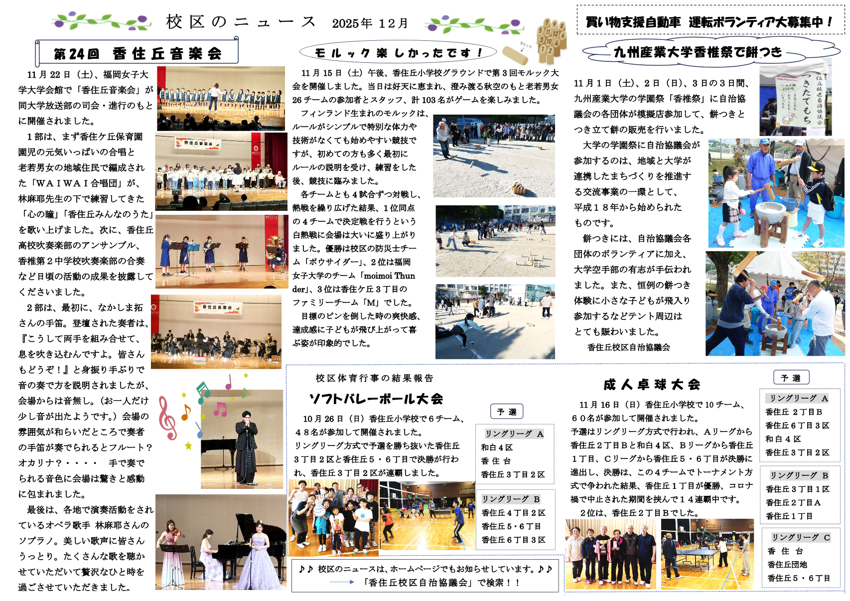 校区のニュース Posted on 2025年12月2日 by 香住丘校区自治協議会 2025年12月No.121 に更新しました。 2025年12月No.121 2025年11月No.120 2025年9月No.119 2025年8月No.118 2025年7月No.117 2025年6月No.116 2025年5月No.115 2025年4月No.114 2024年度 2023年度 2022年度 2021年度 2020年度 2019年度 2018年度 2017年度 2016年度 なお、過去の自治協議会だよりは、福岡市東区地域情報(香住丘校区)のページにも掲載されています。 Tweet